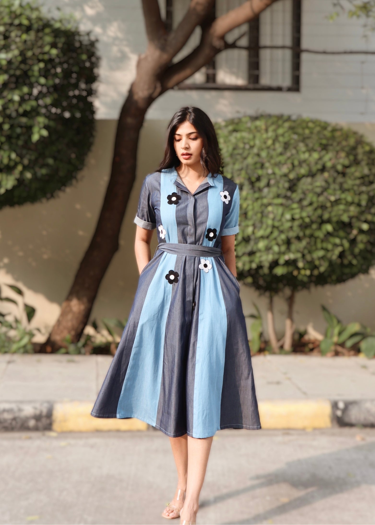 This stylish midi dress blends two shades of denim fabric, creating a chic, contemporary look. The dress is adorned with Rika's signature floral patchwork, adding a touch of elegance and artistry to the design. Perfect for both casual and semi-formal occasions, it combines comfort with a unique flair.